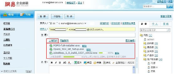 网易企业邮局支持邮件携带大附件,其中标准版支持50M附件,商务版支持100M附件,当上传较大附件时,页面等待时间可能会比较慢。目前网易企业邮推出flash控件上传功能,可以充分提高附件上传的速度。