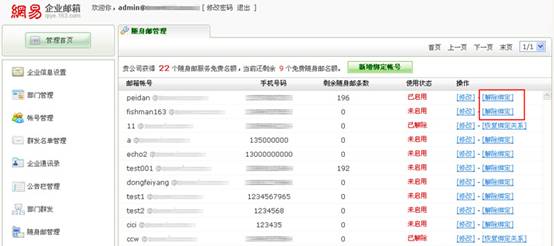在“随身邮管理”中点击“解除绑定”,点“确认”即可。取消该用户的随身邮功能后,该用户会收到系统发出的通知信,并且该用户不能使用随身邮的功能